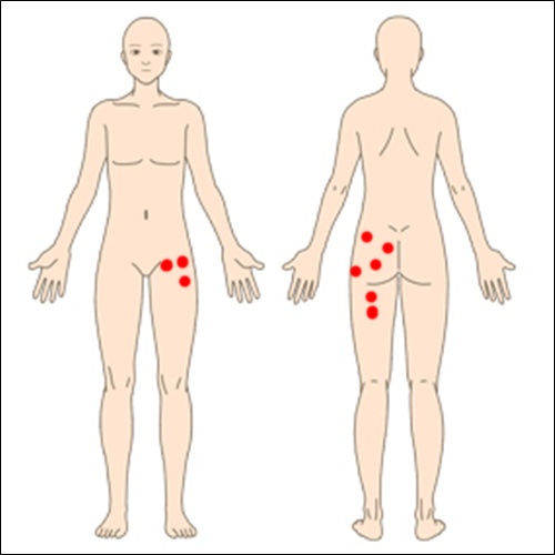 ★下の図のように、赤いマークの腰を中心とした体幹、臀部などのトリガーポイントを治療しました。